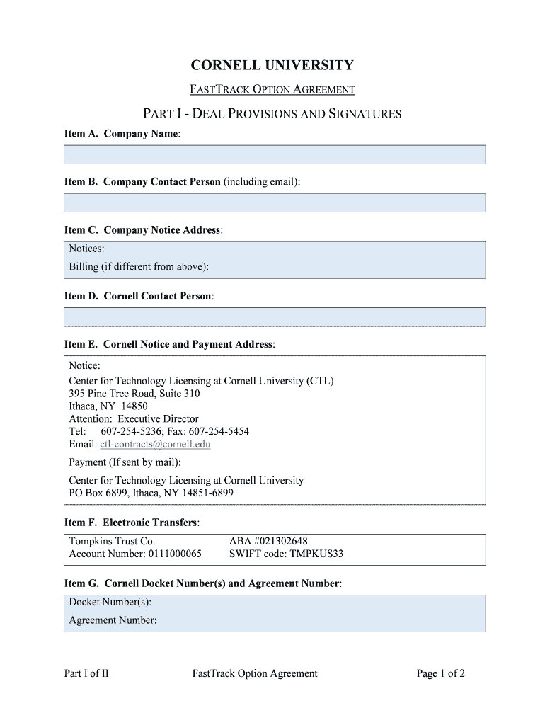 CORNELL UNIVERSITY FASTBACK OPTION AGREEMENTPART I DEAL PROVISIONS AND SIGNATURES Item A. Company Name:Item B. Company Contact Person (including email):Item C. Company Notice Address: Notices: Billing