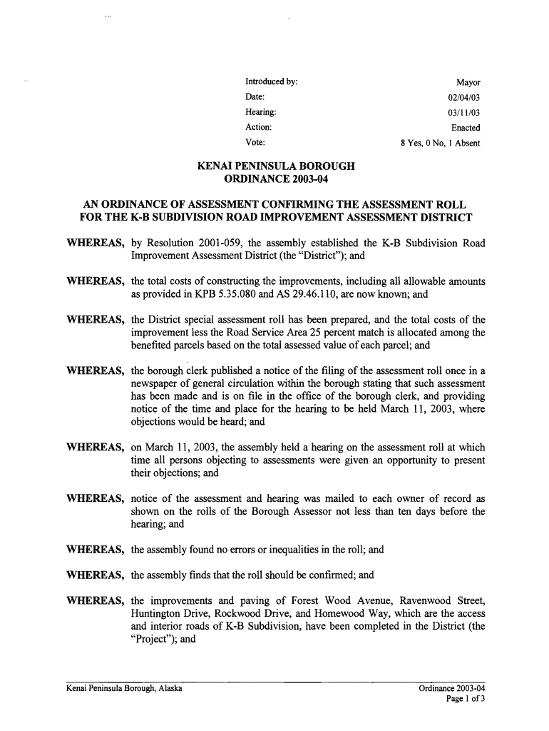 Introduced by:Mandate:02/04/03Hearing:03111/03Action:EnactedVote:8 Yes, 0 No, 1 AbsentKENAI PENINSULA BOROUGH ORDINANCE 200304 AN ORDINANCE OF ASSESSMENT CONFIRMING THE ASSESSMENT ROLL FOR THE KB