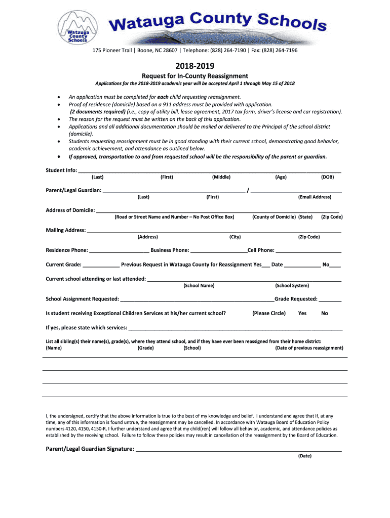 175 Pioneer Trail Boone, NC 28607 Telephone: (828) 2647190 Fax: (828) 264719620182019 Request for County Reassignment Applications for the 20182019 academic year will be accepted April 1 through May