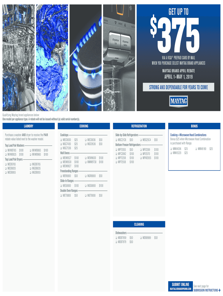 GET UP TO375×VIA A VISA PREPAID CARD BY MAIL WHEN YOU PURCHASE SELECT MAYTAG BRAND APPLIANCES MAYTAG BRAND APRIL REBATEAPRIL 1 MAY 1, 2019STRONG AND DEPENDABLE FOR YEARS TO Prequalifying Maytag brand
