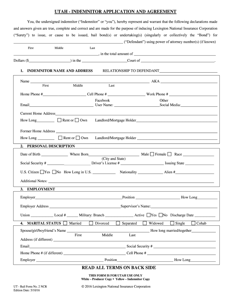 Obtain a Utah bail bond application form from a reputable bail bond agency or a court.