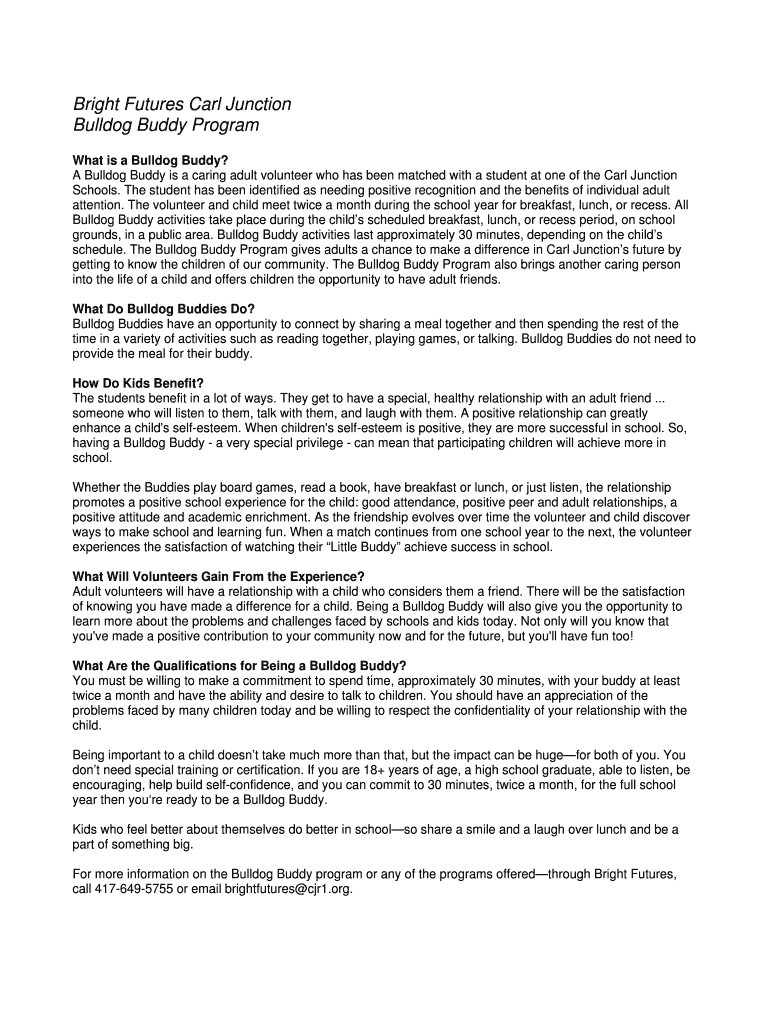 Get the free Bright Futures Carl Junction Bulldog Buddy Program