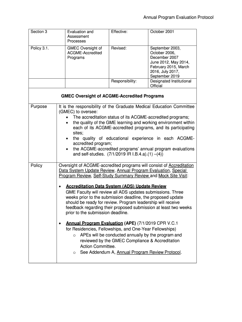 Annual Program Evaluation Protocol Section 3Evaluation and Assessment ProcessesEffective:October 2001Policy 3.1.GMAC Oversight of ACGMEAccredited ProgramsRevised:September 2003, October 2006, December