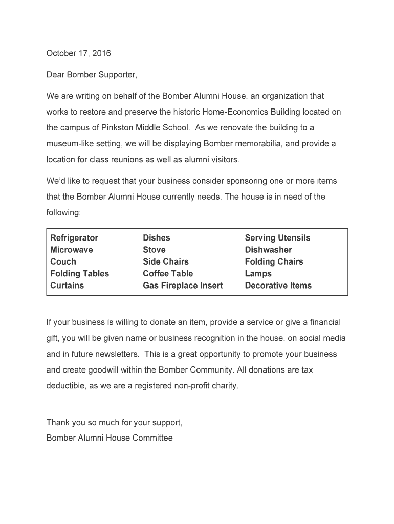 We are writing on behalf of the Bomber Alumni House, an organization that