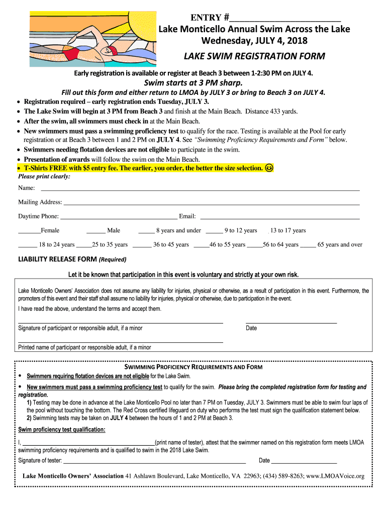 ENTRY # Lake Monticello Annual Swim Across the Lake Wednesday, JULY 4, 2018, LAKE SWIM REGISTRATION FORM Early registration is available or register at Beach 3 between 12:30 PM on JULY 4. Swim starts