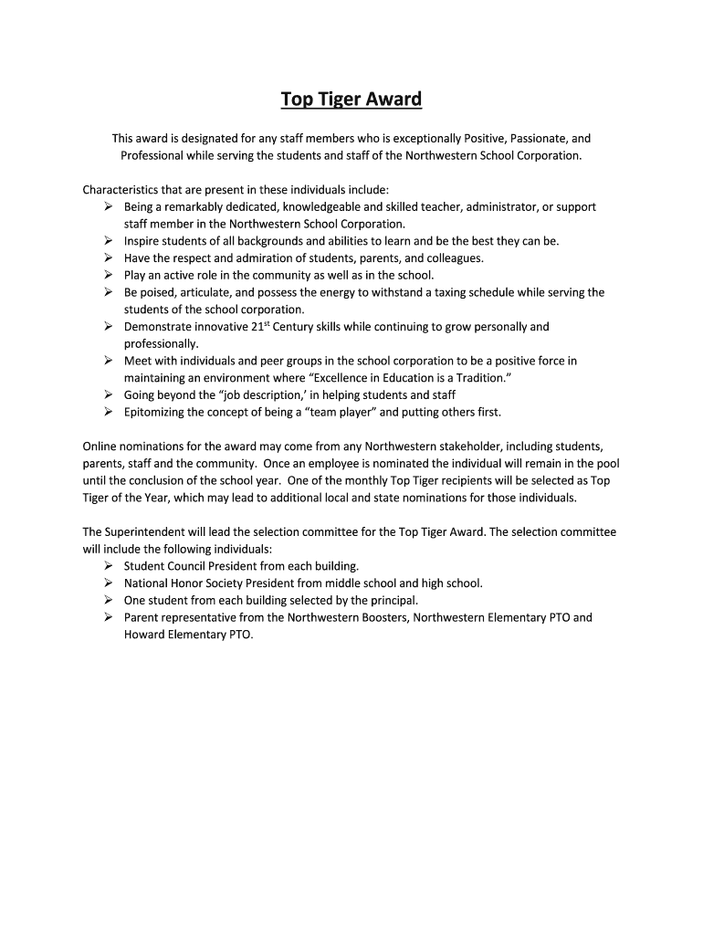 Top Tiger Award This award is designated for any staff members who are exceptionally Positive, Passionate, and Professional while serving the students and staff of the Northwestern School Corporation.