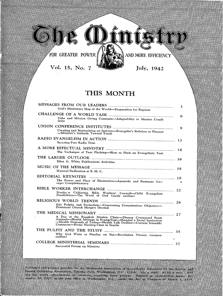TOR GREATER POWER AND MORE EFFICIENCY Vol. 15, No. 7July, 1942THIS MONTH MESSAGES FROM OUR LEADERS .................................. God's Missionary Map of the WorldPreparation for Baptist;CHALLENGE