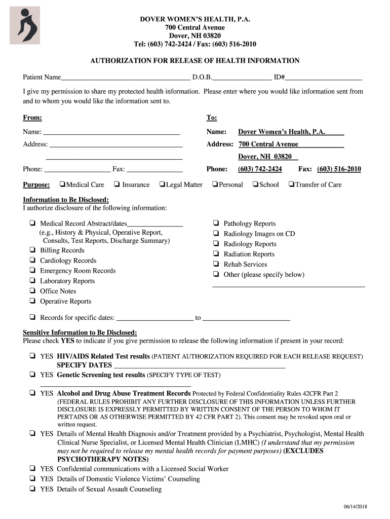 DOVER WOMEN HEALTH, P.A. 700 Central Avenue Dover, NH 03820 Tel: (603) 7422424 / Fax: (603) 5162010 AUTHORIZATION FOR RELEASE OF HEALTH INFORMATION Patient Name D.O.B. ID# I give my permission to