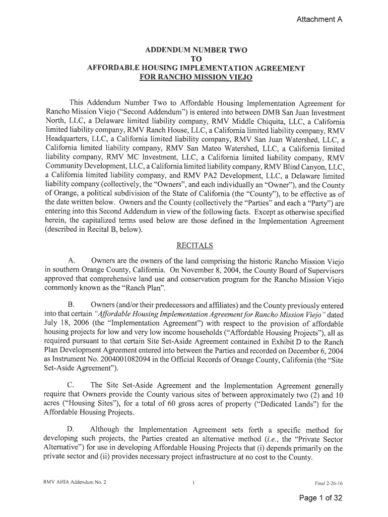 Attachment ADDENDUM NUMBER TWO TO AFFORDABLE HOUSING IMPLEMENTATION AGREEMENT FOR RANCHO MISSION VIEJO This Addendum Number Two to Affordable Housing Implementation Agreement for Rancho Mission Viejo