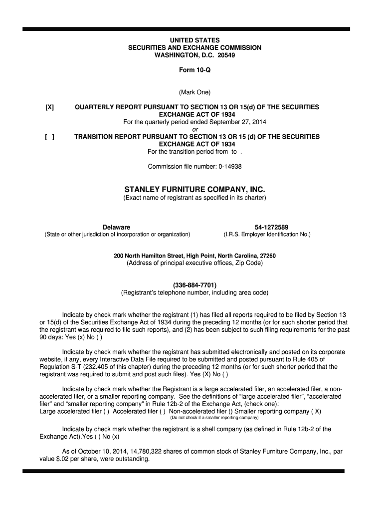 Get the free Stanley Furniture Company, Inc. 10Q 2014 Third Quarter Report
