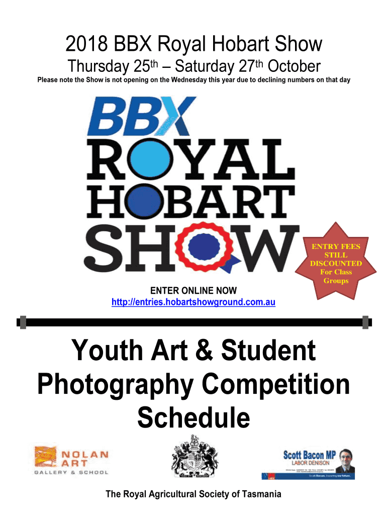 2018 BBX Royal Hobart Show Thursday 25th Saturday 27th OctoberPlease note the Show is not opening on the Wednesday this year due to declining numbers on that entry FEES STILL DISCOUNTED For Class