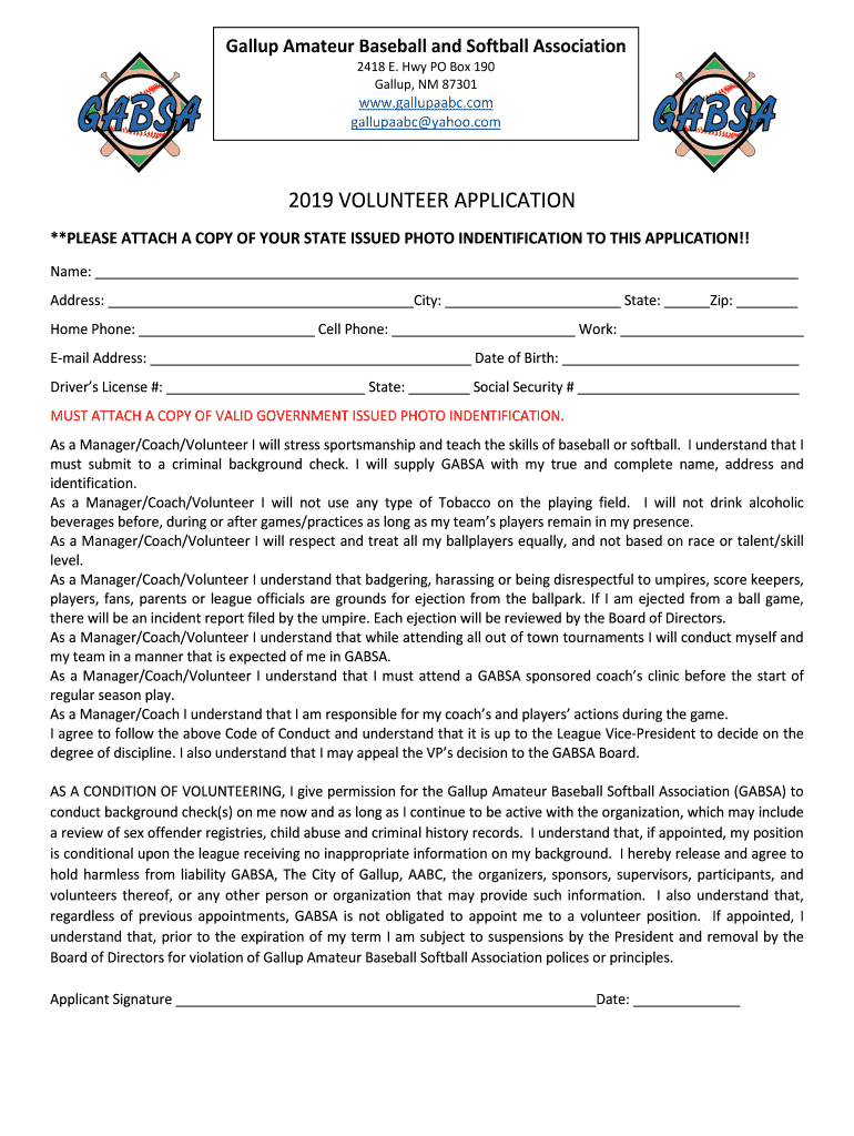 Gallup Amateur Baseball and Softball Association 2418 E. Hwy PO Box 190 Gallup, NM 87301www.gallupaabc.com gallupaabc yahoo.com2019 VOLUNTEER APPLICATION **PLEASE ATTACH A COPY OF YOUR STATE ISSUED