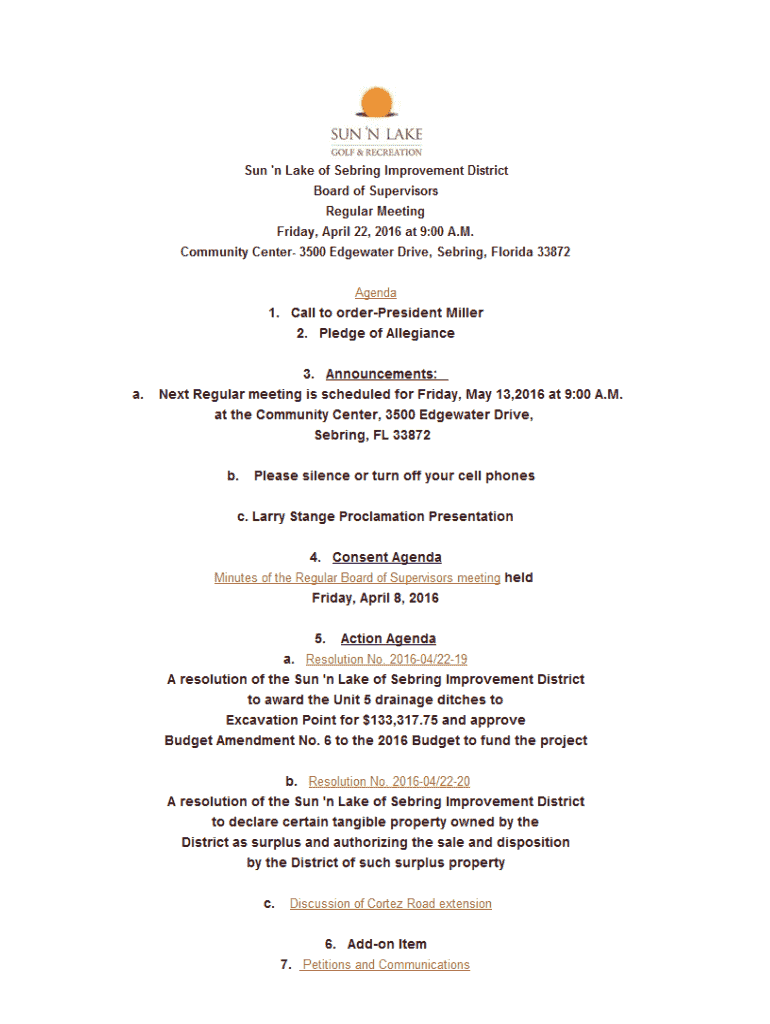 Sun n Lake of Sebring Improvement District Board of Supervisors Regular Meeting Friday, April 22, 2016, at 9:00 A.M. Community Center 3500 Edgewater Drive, Sebring, Florida 33872 AGENDA1. Call to