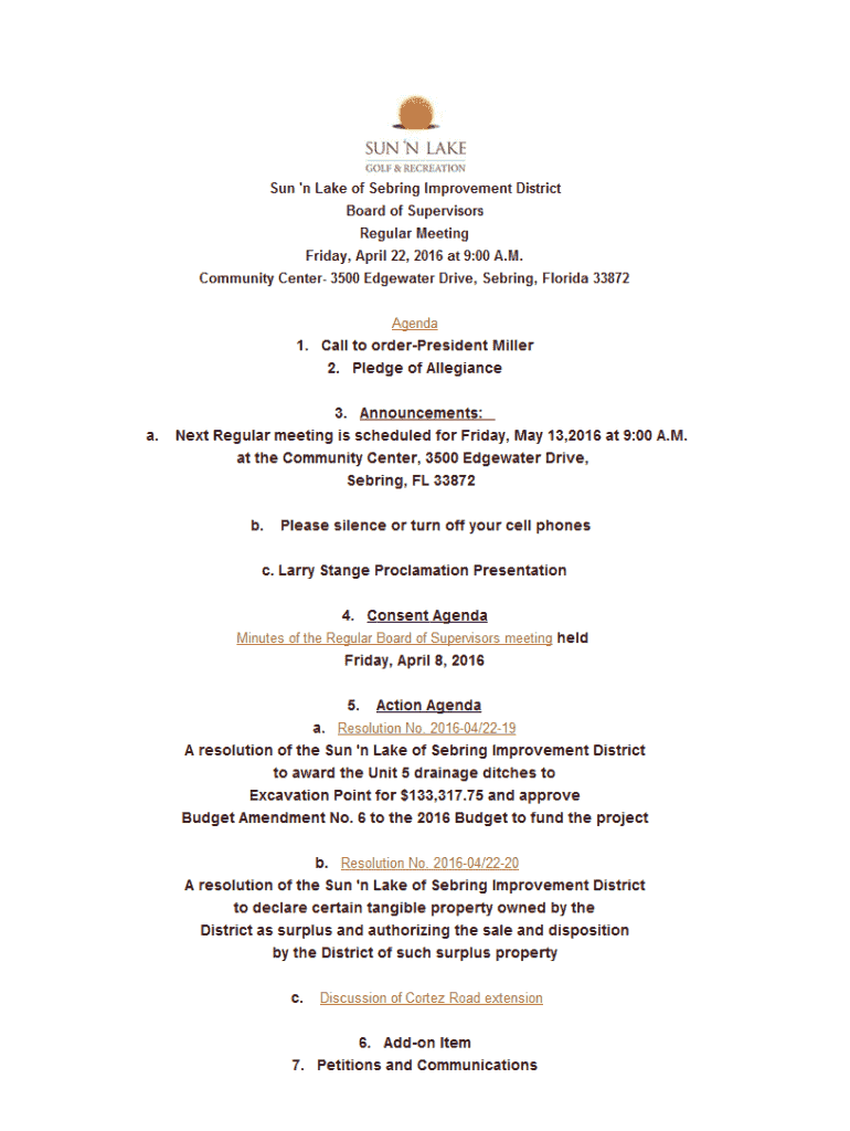 Sun n Lake of Sebring Improvement District Board of Supervisors Regular Meeting Friday, April 22, 2016, at 9:00 A.M. Community Center 3500 Edgewater Drive, Sebring, Florida 33872 AGENDA1. Call to