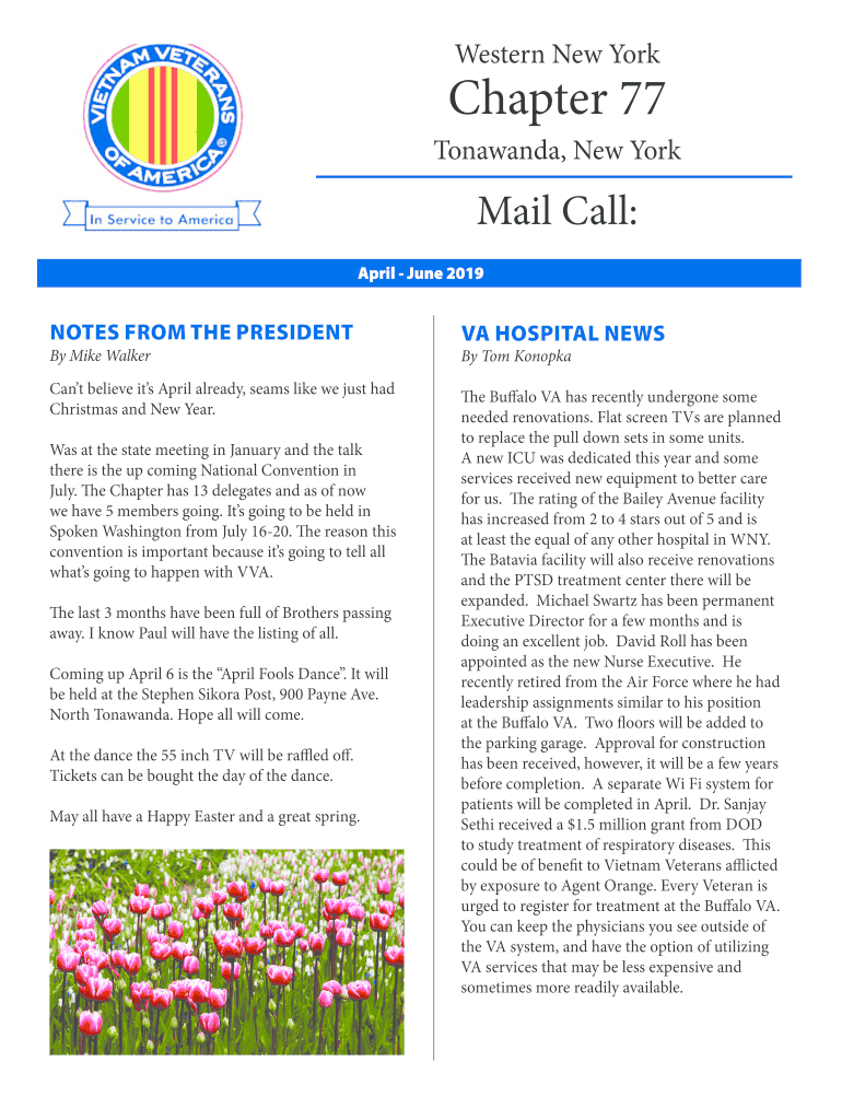 Western New YorkChapter 77Tonawanda, New Formal Call: April June 2019NOTES FROM THE PRESIDENT VA HOSPITAL Newsboy Mike Walker Tom KonopkaCant believe its April already, seams like we just had Christmas