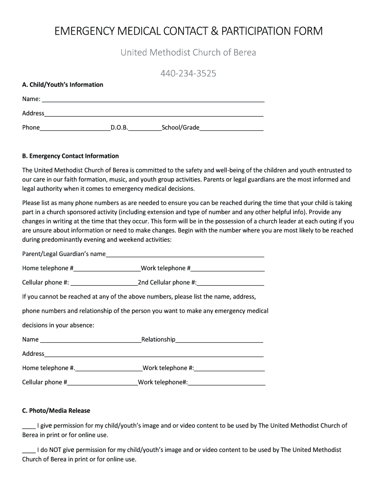 EMERGENCY MEDICAL CONTACT & PARTICIPATION FORM United Methodist Church of Bar 4402343525 A. Child/Youths Information Name: Address Phone D.O.B. School/Grade B. Emergency Contact Information The United
