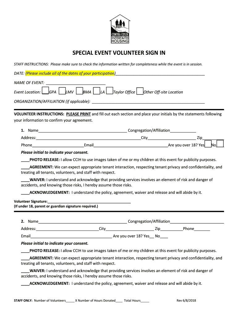 SPECIAL EVENT VOLUNTEER SIGN IN STAFF INSTRUCTIONS: Please make sure to check the information written for completeness while the event is in session.DATE: (Please include all the dates of your participation)