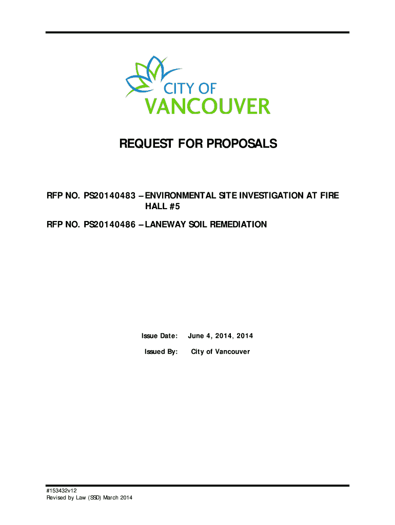 REQUEST FOR PROPOSALS RFP NO. PS20140483 ENVIRONMENTAL SITE INVESTIGATION AT FIRE HALL #5 RFPs NO. PS20140486 ANYWAY SOIL REMEDIATION×153432v12 Revised by Law (SSD) March 2014Issue Date:June 4, 2014,