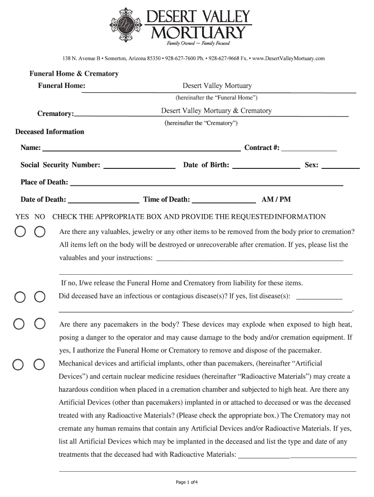 Clear Form138 N. Avenue B Merton, Arizona 85350 9286277600 pH. 9286279668 FX. www.DesertValleyMortuary.comFuneral Home & Crematory Funeral Home:Desert Valley Mortuary (hereinafter the Funeral Home)Crematory:Desert