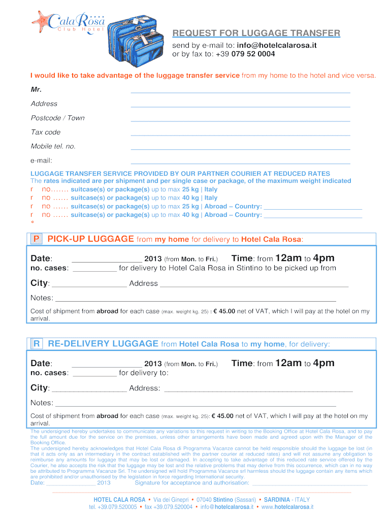 REQUEST FOR LUGGAGE TRANSFER send by email to: info hotelcalarosa.it or by fax to: +39 079 52 0004 I would like to take advantage of the luggage transfer service from my home to the hotel and vice