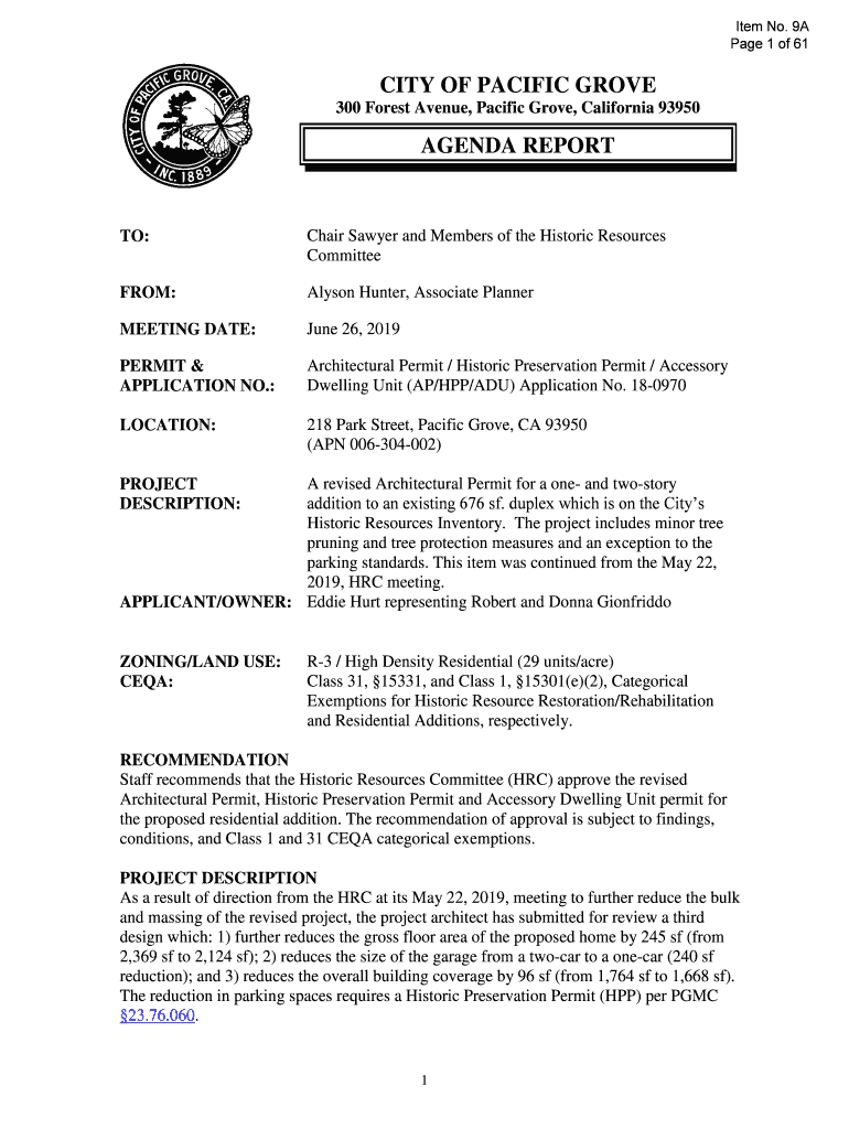 Item No. 9A Page 1 of 61CITY OF PACIFIC GROVE 300 Forest Avenue, Pacific Grove, California 93950AGENDA REPORT TO:Chair Sawyer and Members of the Historic Resources CommitteeFROM:Alyson Hunter, Associate