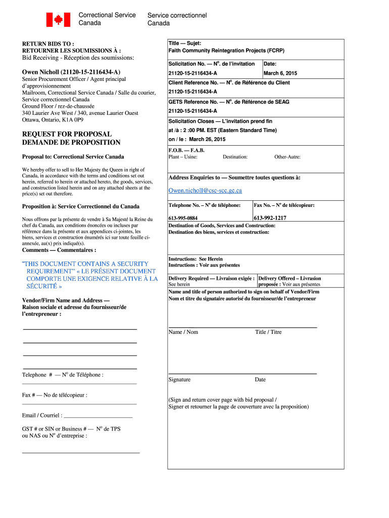 Correctional Service CanadaService correctional CanadaRETURN BIDS TO : RETURNER LES COMMISSIONS :Bid Receiving Reception DES sou missions: Owen Nichols (21120152116434A) Senior Procurement Officer