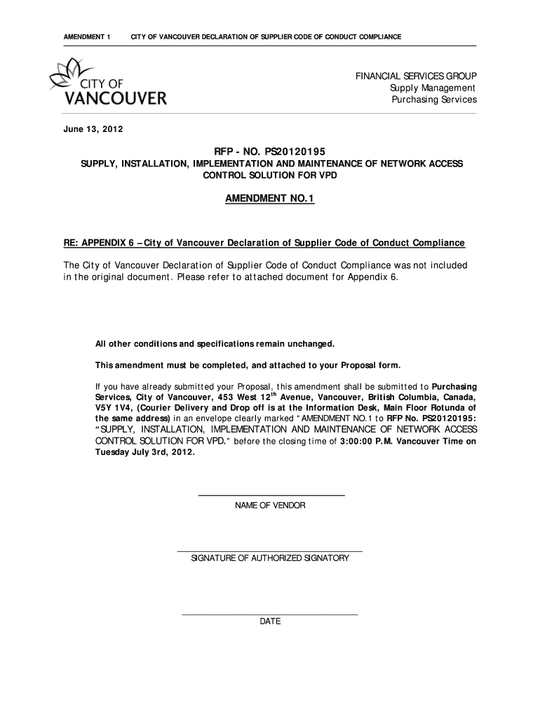AMENDMENT 1CITY OF VANCOUVER DECLARATION OF SUPPLIER CODE OF CONDUCT COMPLIANCEFINANCIAL SERVICES GROUP Supply Management Purchasing Services June 13, 2012RFP NO. PS20120195 SUPPLY, INSTALLATION,