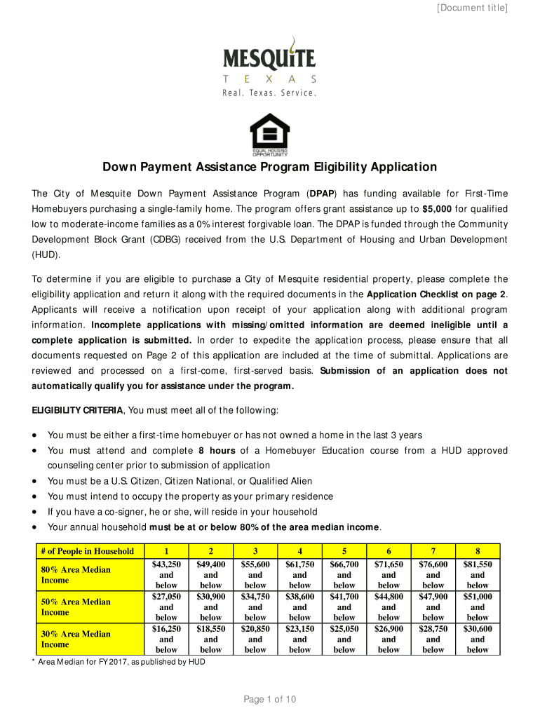 Document title Down Payment Assistance Program Eligibility Application The City of Mesquite Down Payment Assistance Program (PAP) has funding available for First-time Homebuyers purchasing a single