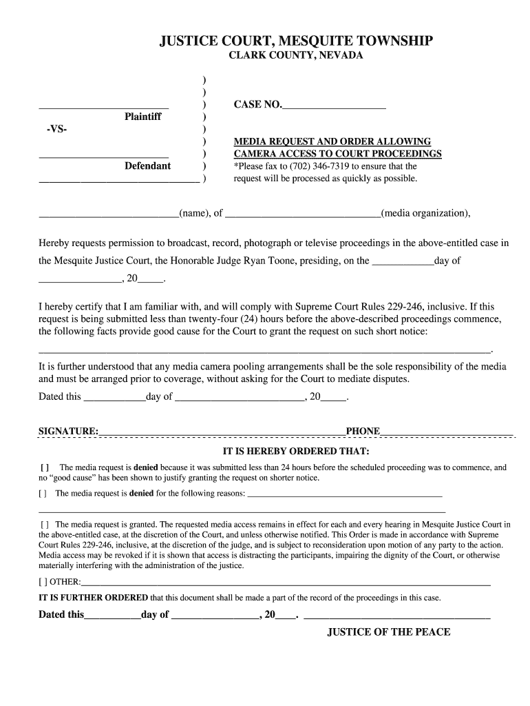 JUSTICE COURT, MESQUITE TOWNSHIP CLARK COUNTY, NEVADA))) Plaintiff) VS))) Defendant))CASE NO. MEDIA REQUEST AND ORDER ALLOWING CAMERA ACCESS TO COURT PROCEEDINGS *Please fax to (702) 3467319 to ensure