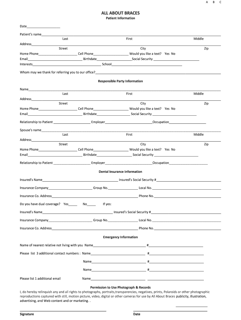ABC ALL ABOUT BRACES Patient Informational Patients name Last First Middle Address Street City Zip Home Phone Cell Phone Would you like a text? Yes No Email Birthdate Social Security Interests School