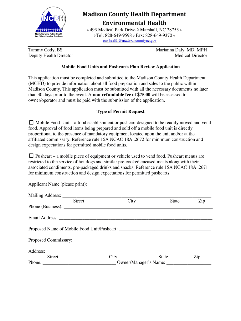Madison County Health Department Environmental Health 493 Medical Park Drive Marshall, NC 28753 Tel: 8286499598 Fax: 8286499370 health madisoncountync.gov Tammy Cody, BS Deputy Health DirectorMarianna
