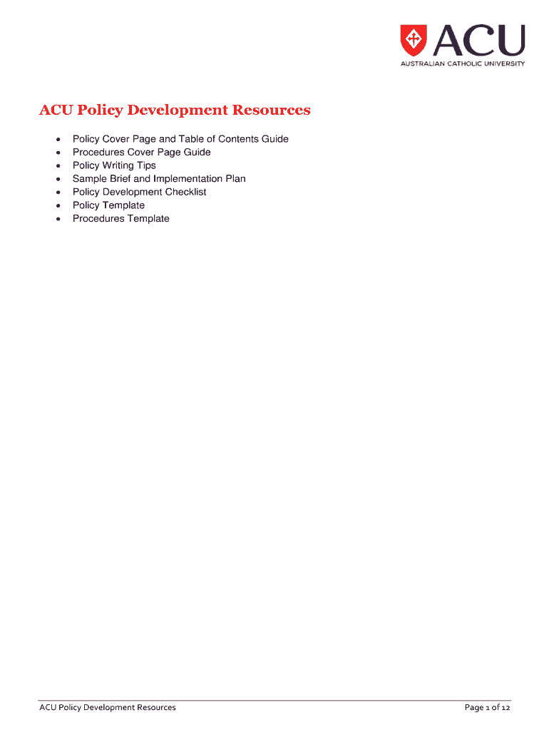 ACU Policy Development Resources Policy Cover Page and Table of Contents Guide Procedures Cover Page Guide Policy Writing Tips Sample Brief and Implementation Plan Policy Development Checklist Policy