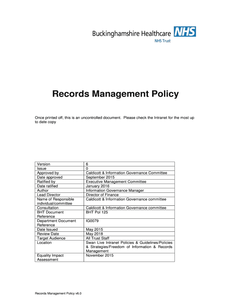 Records Management Policy Once printed off, this is an uncontrolled document. Please check the Intranet for the most up to date conversion Issue Approved by Date approved Ratified by Date ratified