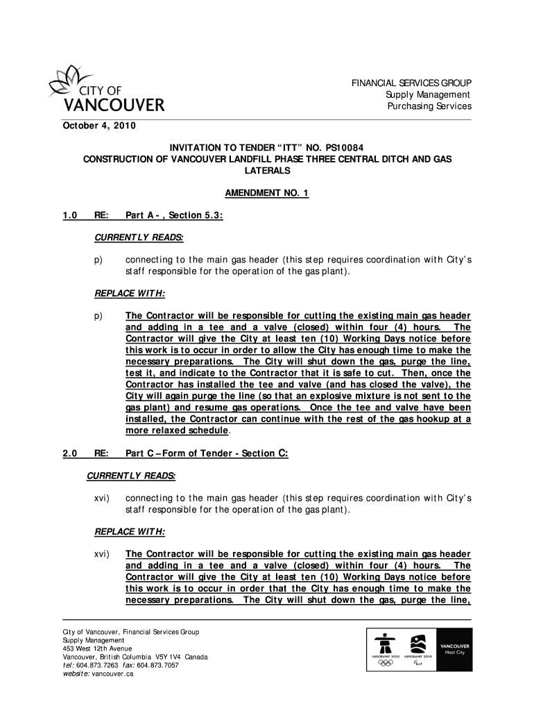 FINANCIAL SERVICES GROUP Supply Management Purchasing Services October 4, 2010, INVITATION TO TENDER ITT NO. PS10084 CONSTRUCTION OF VANCOUVER LANDFILL PHASE THREE CENTRAL DITCH AND GAS LATERALS AMENDMENT