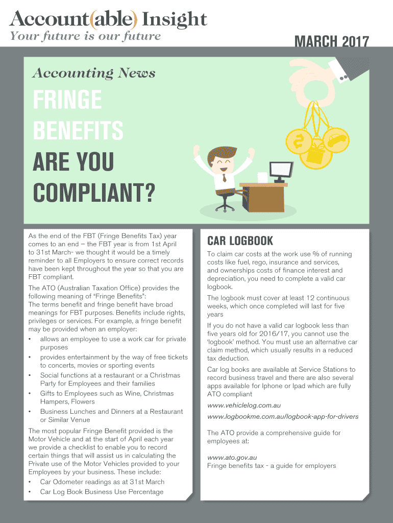 Insightful future is our futureMARCH 2017Accounting Newsprint BENEFITS ARE YOU COMPLIANT? As the end of the FBI (Fringe Benefits Tax) year comes to an end the FBI year is from 1st April to 31st March