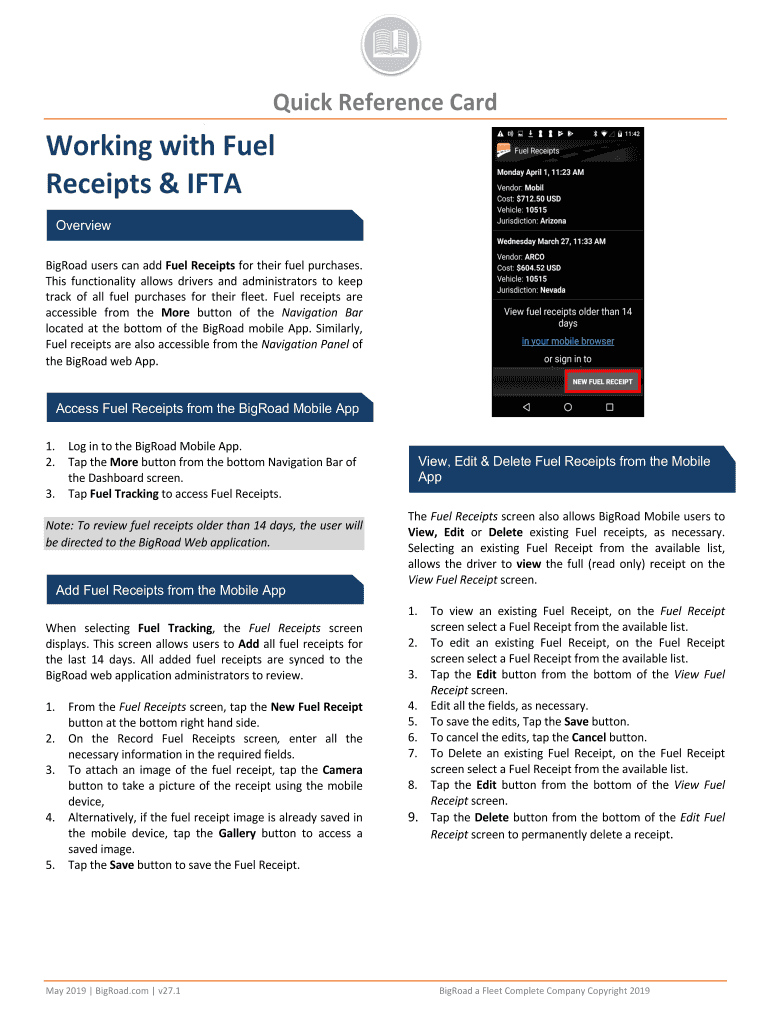 Quick Reference Card Working with Fuel Receipts & IFTA Overview Broad users can add Fuel Receipts for their fuel purchases. This functionality allows drivers and administrators to keep track of all