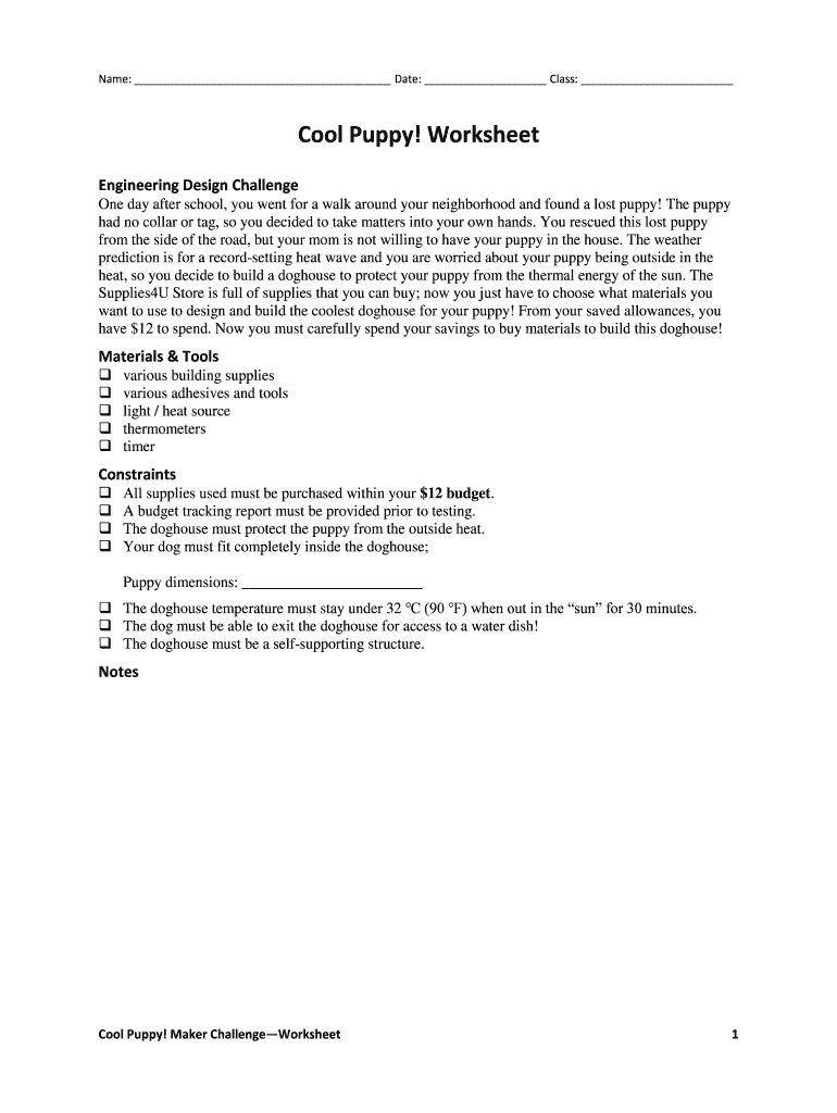 Name: Date: Class: Cool Puppy! Worksheet Engineering Design Challenge One day after school, you went for a walk around your neighborhood and found a lost puppy! The puppy had no collar or tag, so