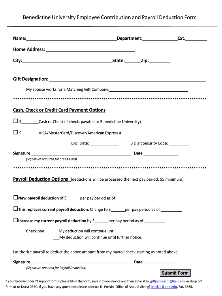 Benedictine University Employee Contribution and Payroll Deduction Form