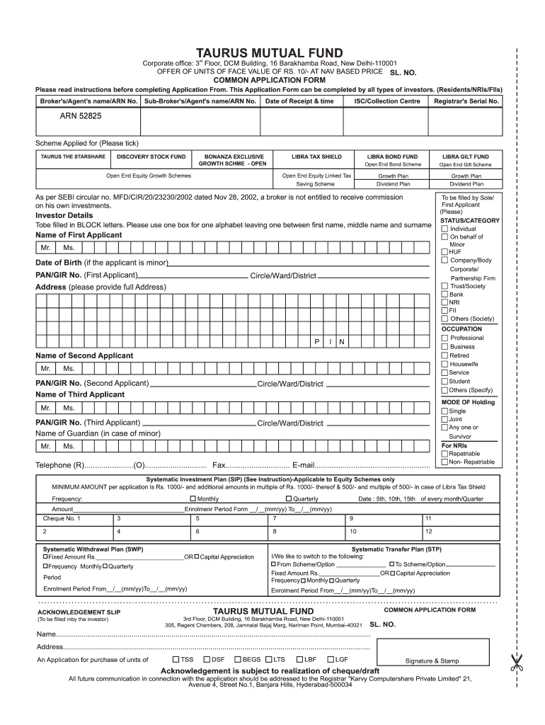 TAURUS MUTUAL Incorporate office: 3rd Floor, DCM Building, 16 Barakhamba Road, New Delhi110001 OFFER OF UNITS OF FACE VALUE OF RS. 10/ AT NAV BASED PRICE SL. NO.COMMON APPLICATION FORM Please read