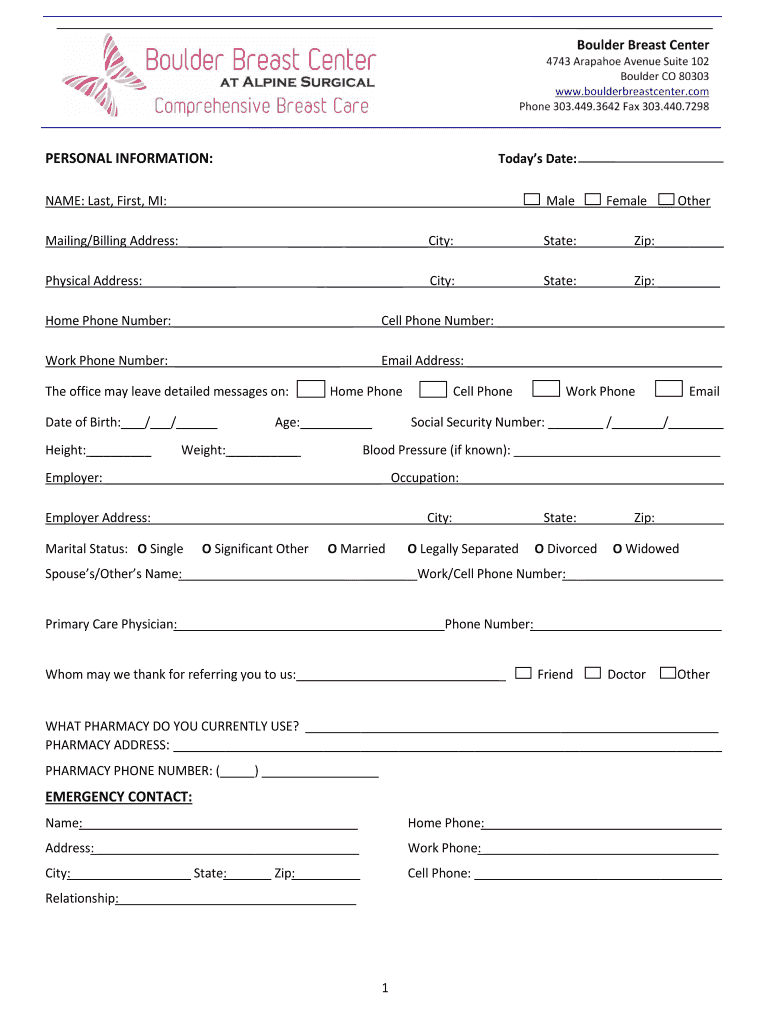 PERSONAL INFORMATION:Today's Date:NAME: Last, First, MI: Emailing/Billing Address: State:Zip: State:Zip: Physical Address: City: City:Female Bothersome Phone Number: Cell Phone Number: Work Phone
