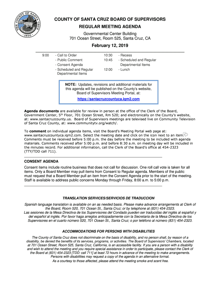 COUNTY OF SANTA CRUZ BOARD OF SUPERVISORS REGULAR MEETING AGENDA Governmental Center Building 701 Ocean Street, Room 525, Santa Cruz, CA February 12, 2019 9:00 Call to Order Public Comment Consent
