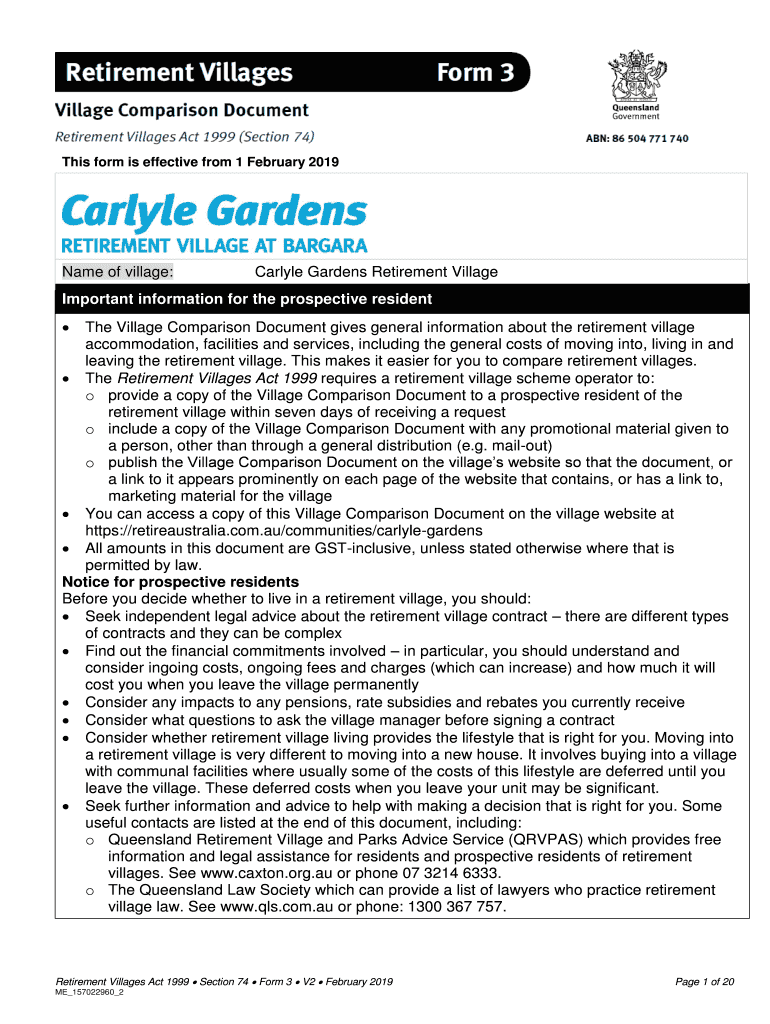 This form is effective from 1 February 2019Name of village:Carlyle Gardens Retirement VillageImportant information for the prospective resident The Village Comparison Document gives general information