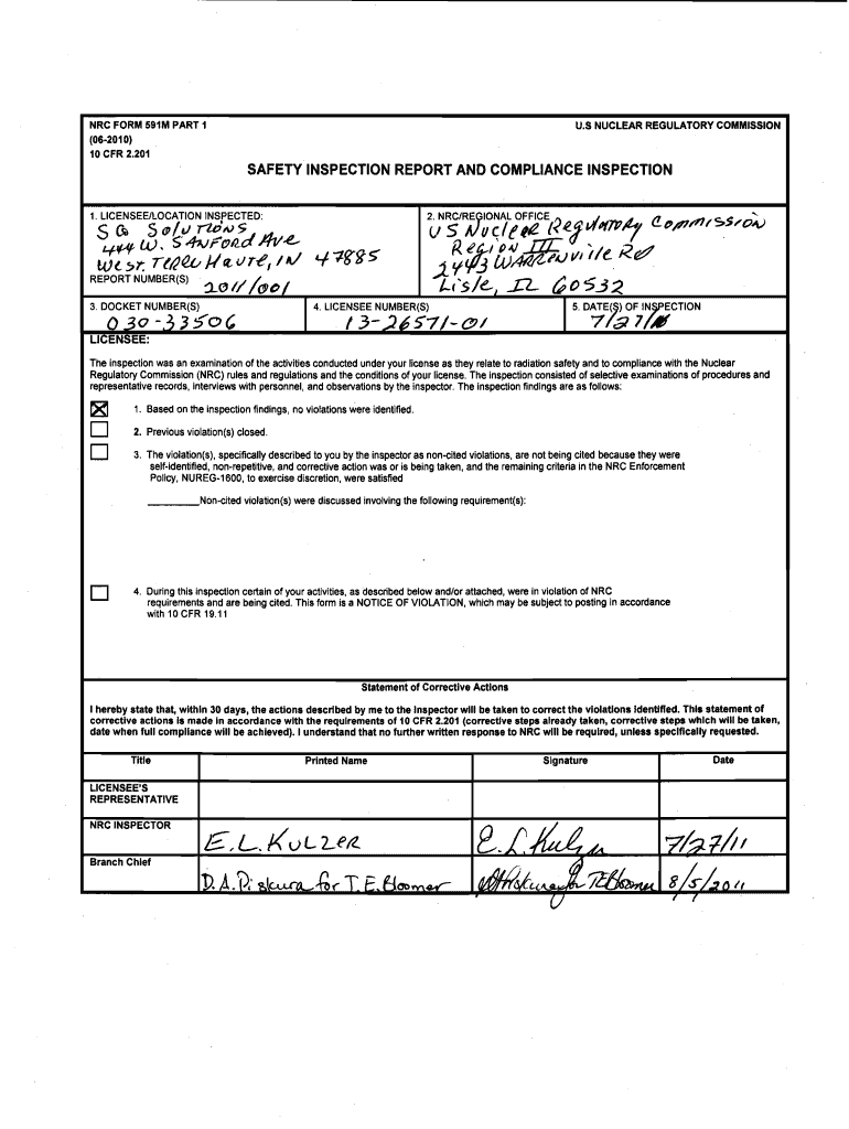 NRC FORM 591M PART 1 (062010) 10 CFR 2.201U. S NUCLEAR REGULATORY COMMISSIONSAFETY INSPECTION REPORT AND COMPLIANCE INSPECTION2. NRC/TONAL OFFICE 1. LICENSEE/LOCATION INSPECTED:suffix S W, (I/Vu5rWlV