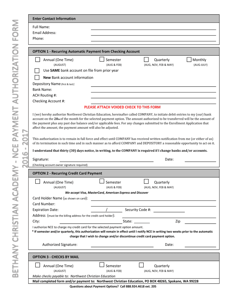 20162017BETHANYCHRISTIANACADEMYNCEPAYMENTAUTHORIZATIONFORMEnterContactInformation Filename: Misaddress: Phone: OPTION1RecurringAutomaticPaymentfromCheckingAccount Annual(Onetime)Semester(AUGUST)(AUGER)QuarterlyMonthly(AUG,