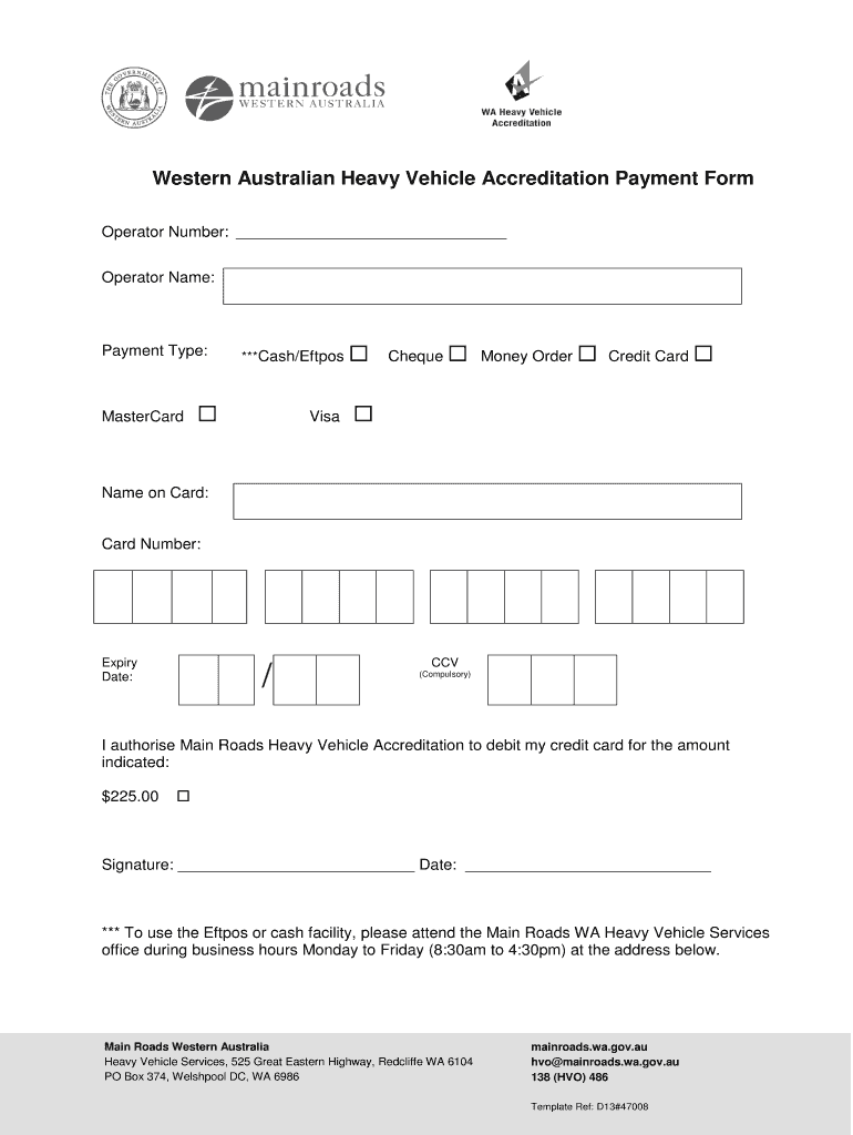 Western Australian Heavy Vehicle Accreditation Payment Form Operator Number: Operator Name:Payment Type:MasterCard***Cash/EftposVisaCheque Money Order Credit Card Name on Card:Card Number:Expiry Date:/CCV