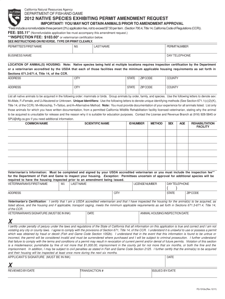 California Natural Resources AgencyPrintDEPARTMENT OF FISH AND GAMEClear2012 NATIVE SPECIES EXHIBITING PERMIT AMENDMENT REQUEST