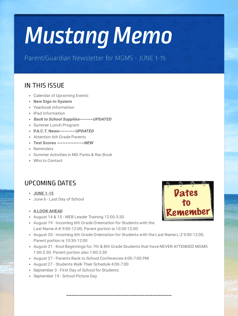 Mustang Memo Parent/Guardian Newsletter for MMS JUNE 115IN THIS ISSUE Calendar of Upcoming Events New Signing System Yearbook Information iPad Information Back to School SuppliesUPDATED Summer Lunch