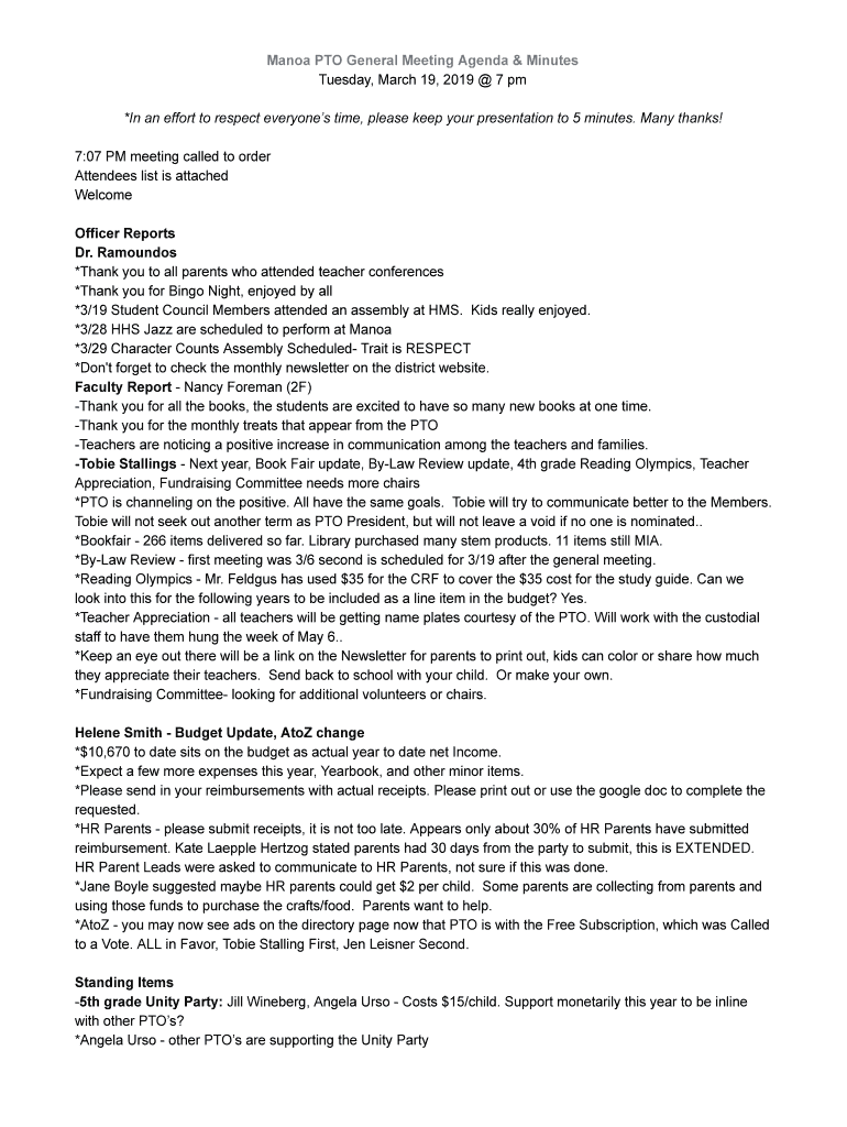 3/25/2019Manoa PTO Meeting Agenda for March Google DocsManoa PTO General Meeting Agenda & Minutes Tuesday, March 19, 2019 7 pm *In an effort to respect everyone's time, please keep your presentation