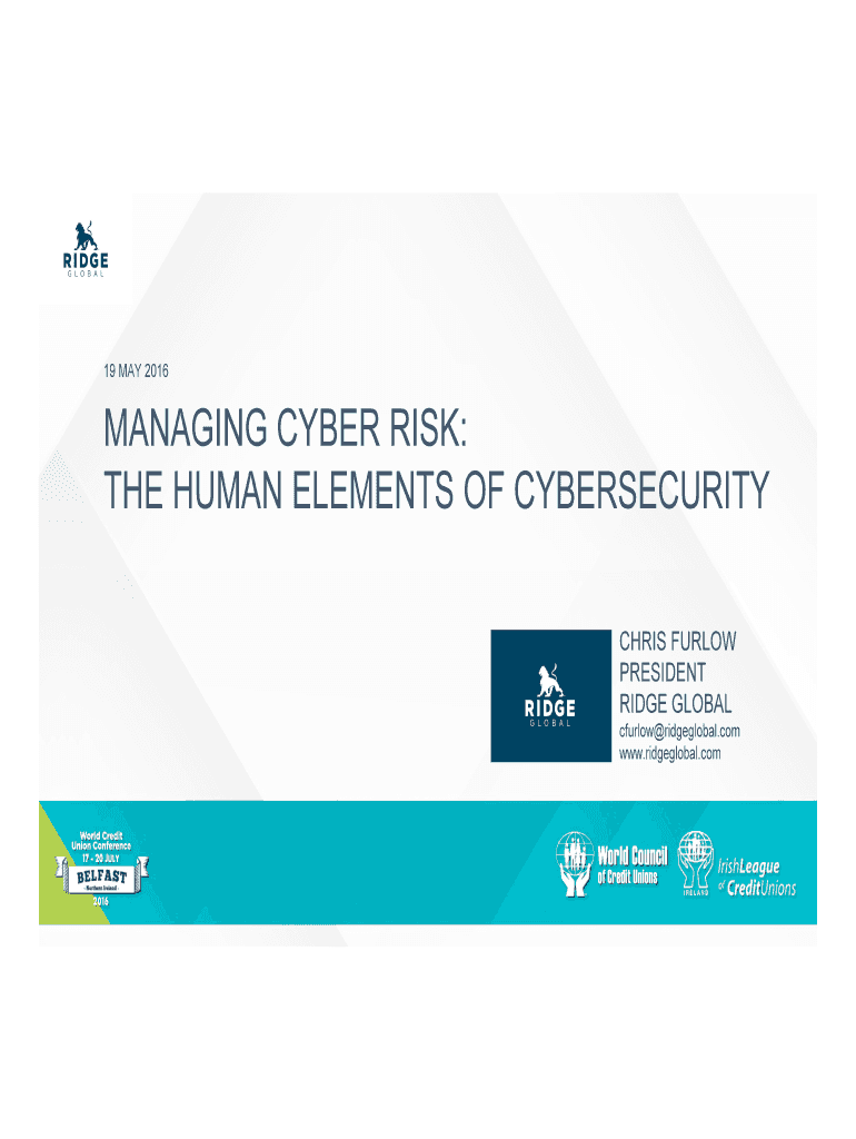 19 MAY 2016MANAGING CYBER RISK: THE HUMAN ELEMENTS OF CYBERSECURITY CHRIS FURROW PRESIDENT RIDGE GLOBAL furrow ridgeglobal.com www.ridgeglobal.comABOUT RIDGE Globalize Global is the risk management