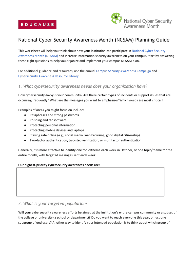 Government agencies, organizations, and individuals participating in NCSAM are required to fill out the NCSAM Planning Worksheet National.